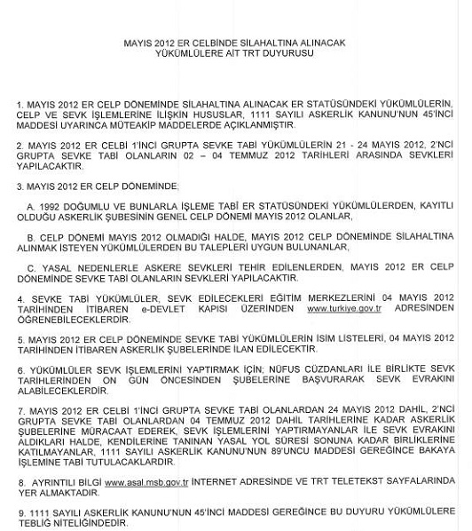 Mayıs 2012 Er Celbinde Silahaltına Alınacak Yükümlülere Ait TRT Duyurusu