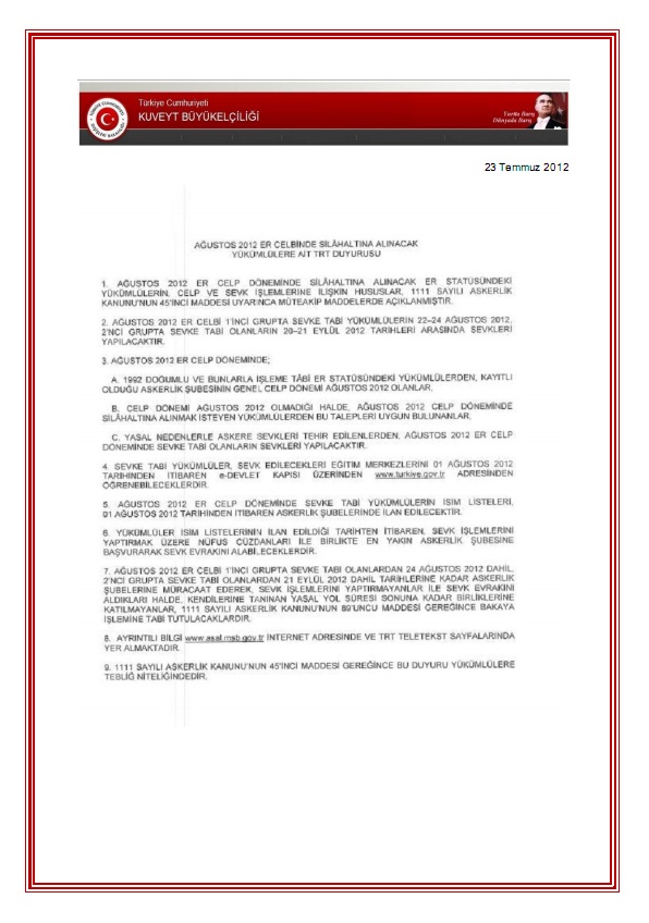 Ağustos 2012 Er Celbinde Silahaltına Alınacak Yükümlülere Ait TRT Duyurusu