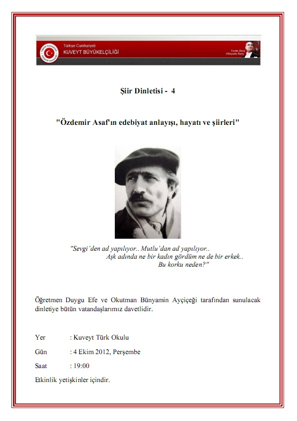 "Özdemir Asaf'ın edebiyat anlayışı, hayatı ve şiirleri" "Sevgi’den ad yapılıyor.. Mutlu’dan ad yapılıyor.. Bu korku neden?" Öğretmen Duygu Efe ve Okutman Bünyamin Ayçiçeği tarafından sunulacak dinletiye bütün vatandaşlarımız davetlidir. Yer : Kuveyt Türk Okulu Gün : 4 Ekim 2012, Perşembe Saat : 19:00 Etkinlik yetişkinler içindir.