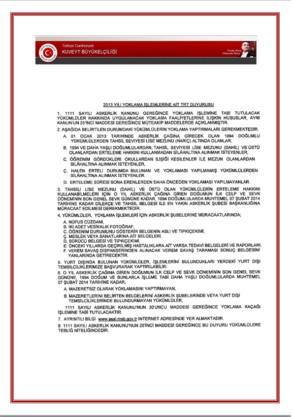 2013 Yılı Yoklama İşlemlerine Ait TRT Duyurusu