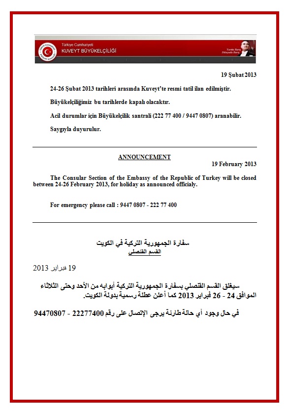 24-26 Şubat 2013 tarihleri arasında Kuveyt’te resmi tatil ilan edilmiştir.