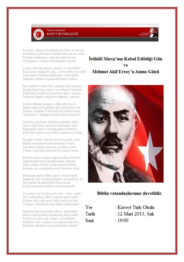 "İstiklâl Marşı'nın Kabul Edildiği Gün ve Mehmet Akif Ersoy'u Anma Günü" etkinliğine bütün vatandaşlarımız davetlidir.