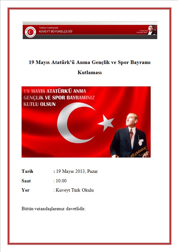 Kutlaması Tarih : 19 Mayıs 2013, Pazar Saat : 10.00 Yer : Kuveyt Türk Okulu Bütün vatandaşlarımız davetlidir.