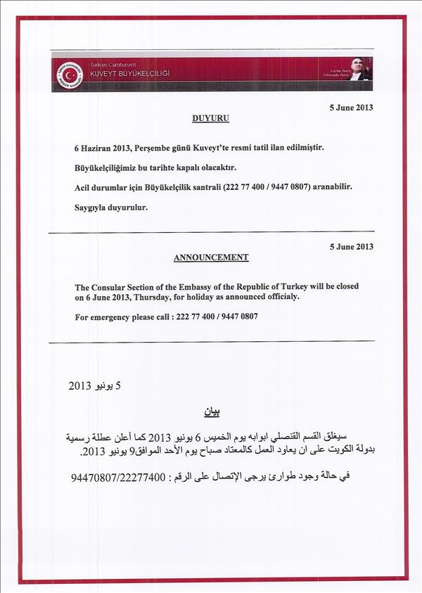 6 Haziran 2013, Perşembe günü Kuveyt'te resmi tatil ilan edilmiştir. Büyükelçiliğimiz bu tarihte kapalı olacaktır. Acil durumlar için Büyükelçilik santrali (222 77 400 / 944 70807)aranabilir. Saygıyla duyurulur.