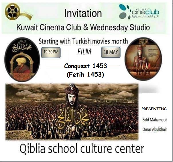 Kuveyt Sinema Kulübü ile Wednesday Studio tarafından Qiblia School Culture Center'da 18 Mayıs 2016 Çarşamba günü Saat: 19:30'da "Fetih 1453" adlı film gösterimi yapılacaktır.