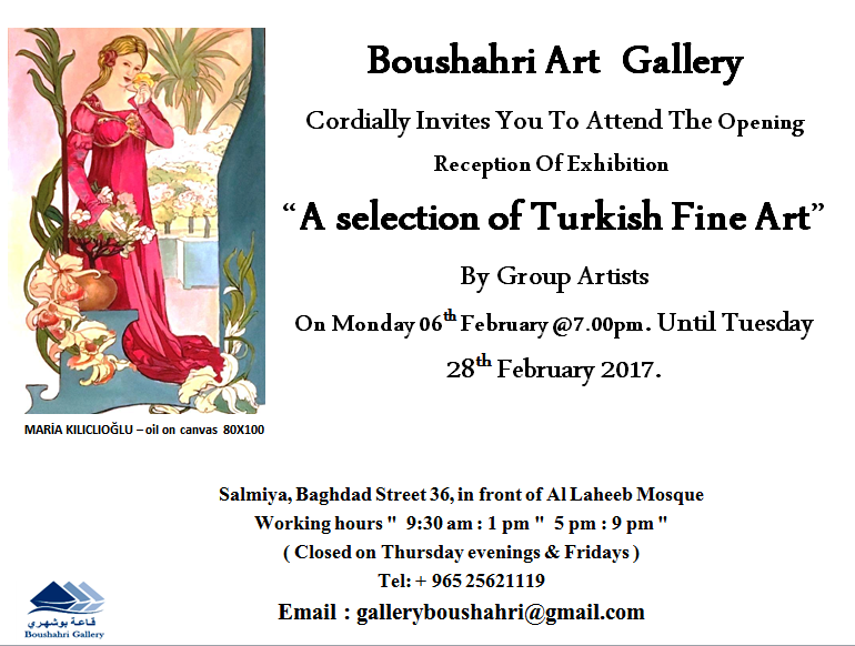 Devrim Erbil, Yücel Dönmez, Tuncay Topçu, Ünsal Bahtiyar, Maria Kılıçoğlu, Yalçın Bilgin ve Gülseli İnal gibi ünlü Türk ressamların çalışmalarının yer alacağı resim sergisi6 Şubat 2017 günü saat 19:00'da Boushahri Gallery'de açılacaktır. Sergi 28 Şubat 2017 tarihine kadar sürecektir.