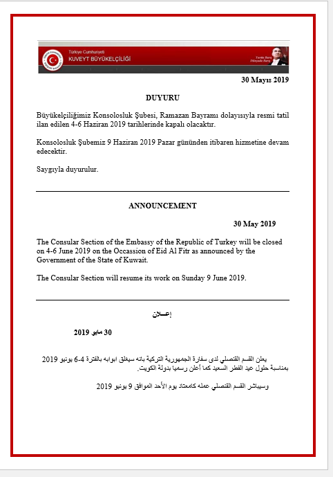 Konsolosluk İşlemleri 08:30 - 13:00 / 14:00-15:30