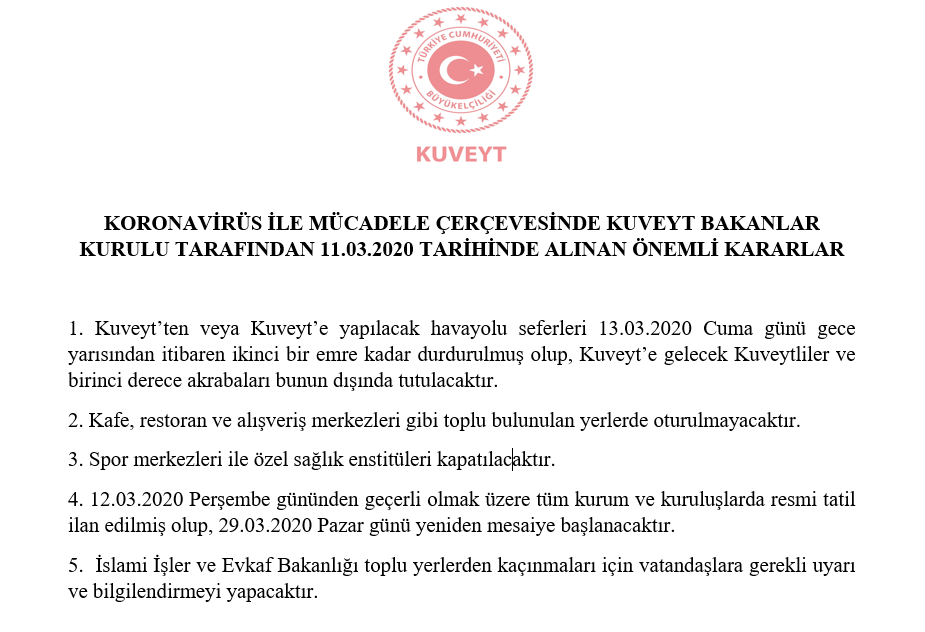 Kuveyt’ten veya Kuveyt’e yapılacak havayolu seferlerinin 13.03.2020 Cuma günü gece yarısından itibaren ikinci bir emre kadar durdurulmuş olup, Kuveyt’e gelecek Kuveytliler ve birinci derece akrabaları bunun dışında tutulacaktır.