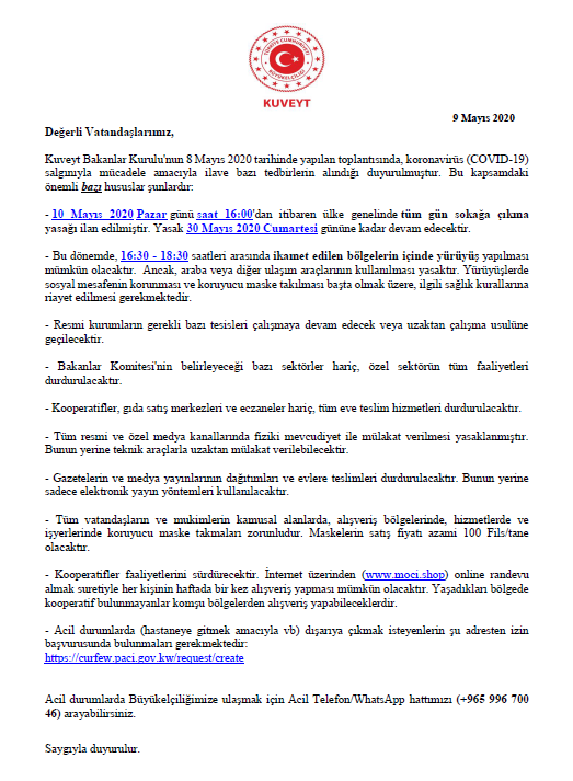 KUVEYT'TE UYGULANACAK SOKAĞA ÇIKMA YASAĞINA İLİŞKİN DUYURU