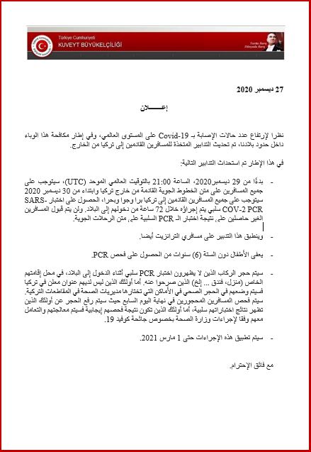 نظرا لإرتفاع عدد حالات الإصابة بـ Covid-19 على المستوى العالمي، وفي إطار مكافحة هذا الوباء داخل حدود بلادنا، تم تحديث التدابير المتخذة للمسافرين القادمين إلى تركيا من الخارج.