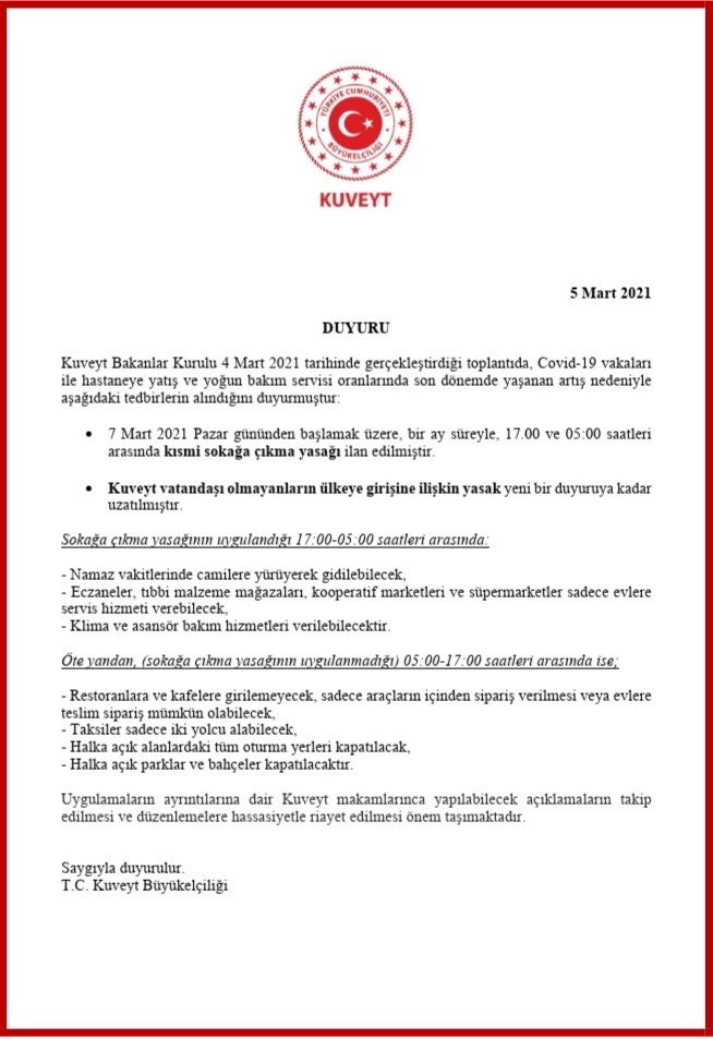 Kuveyt Bakanlar Kurulu'nun Covid-19 salgınıyla mücadele tedbirleri kapsamında aldığı kararlara ilişkin duyurumuz.