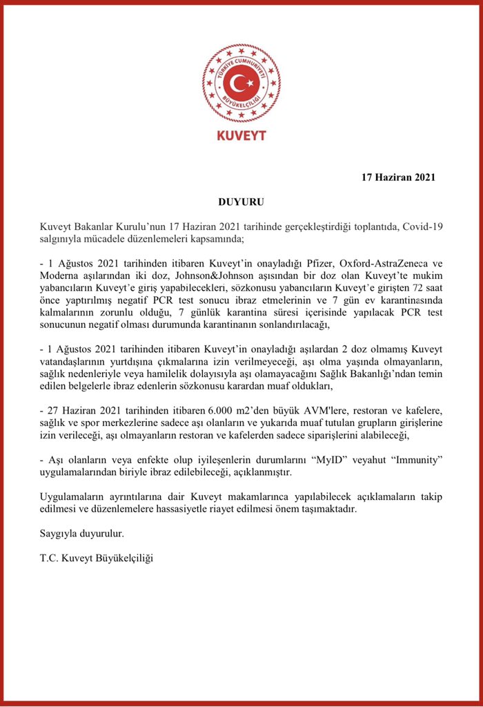 Kuveyt Bakanlar Kurulu tarafından 17 Haziran 2021 tarihinde Covid-19 bağlamında alınan kararlara ilişkin duyurumuz
