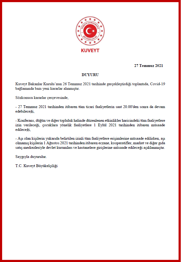 Kuveyt Bakanlar Kurulu'nun 26 Temmuz 2021 tarihinde Covid-19 bağlamında aldığı bazı yeni kararlara ilişkin duyurumuz.