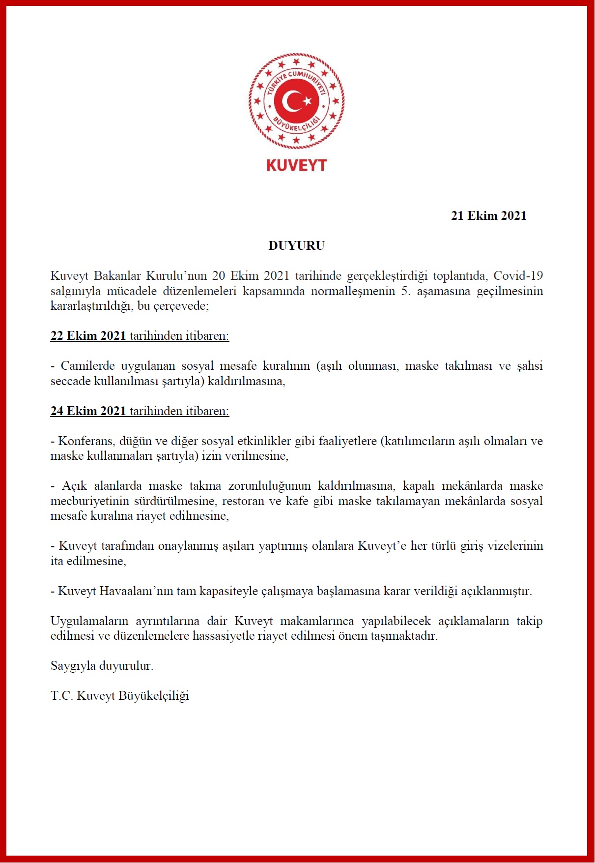 Kuveyt Bakanlar Kurulu tarafından Covid-19 salgınıyla mücadele düzenlemeleri kapsamında alınan kararlara ilişkin duyuru.