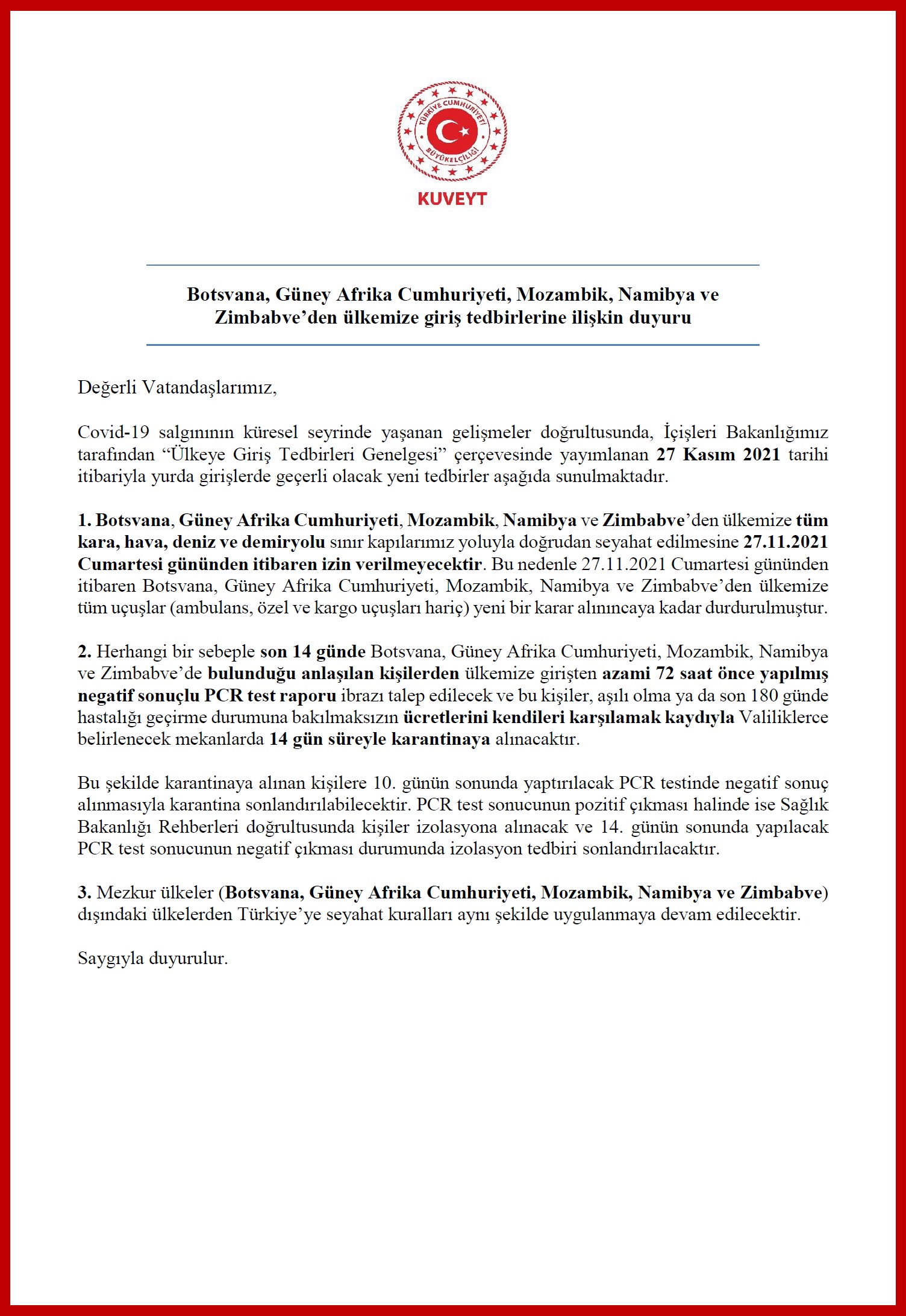 Bazı Afrika ülkelerinden ülkemize giriş tedbirlerine ilişkin duyuru.