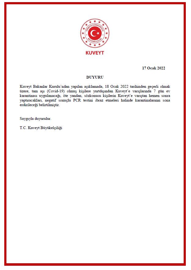 Kuveyt Bakanlar Kurulu tarafından ülkeye girişler ve Covid-19'la mücadele tedbirleri hususunda alınan kararlara ilişkin güncel duyuru