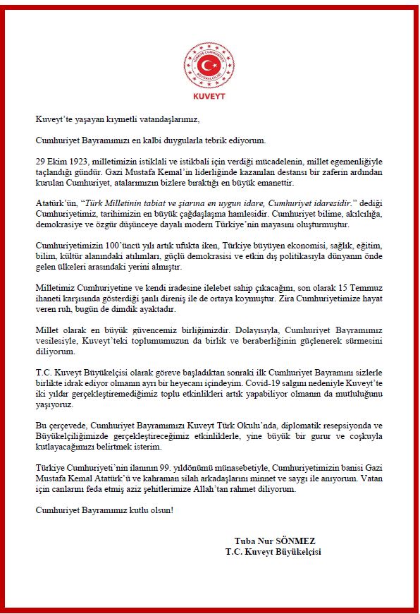 Büyükelçimiz Tuba Nur Sönmez'in 29 Ekim Cumhuriyet Bayramı Mesajı