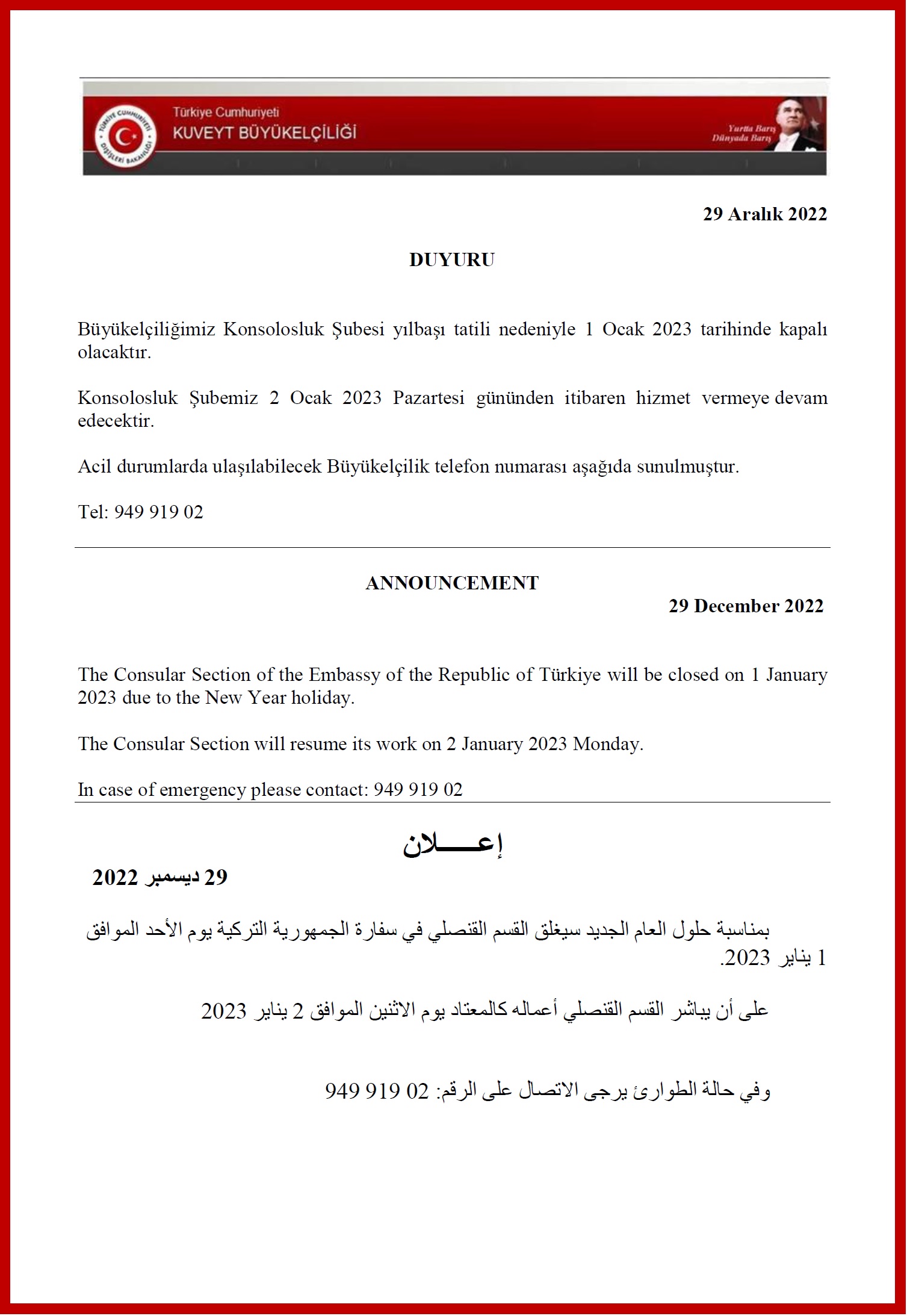 Konsolosluk İşlemleri 08:30 - 13:00 / 14:00-15:30