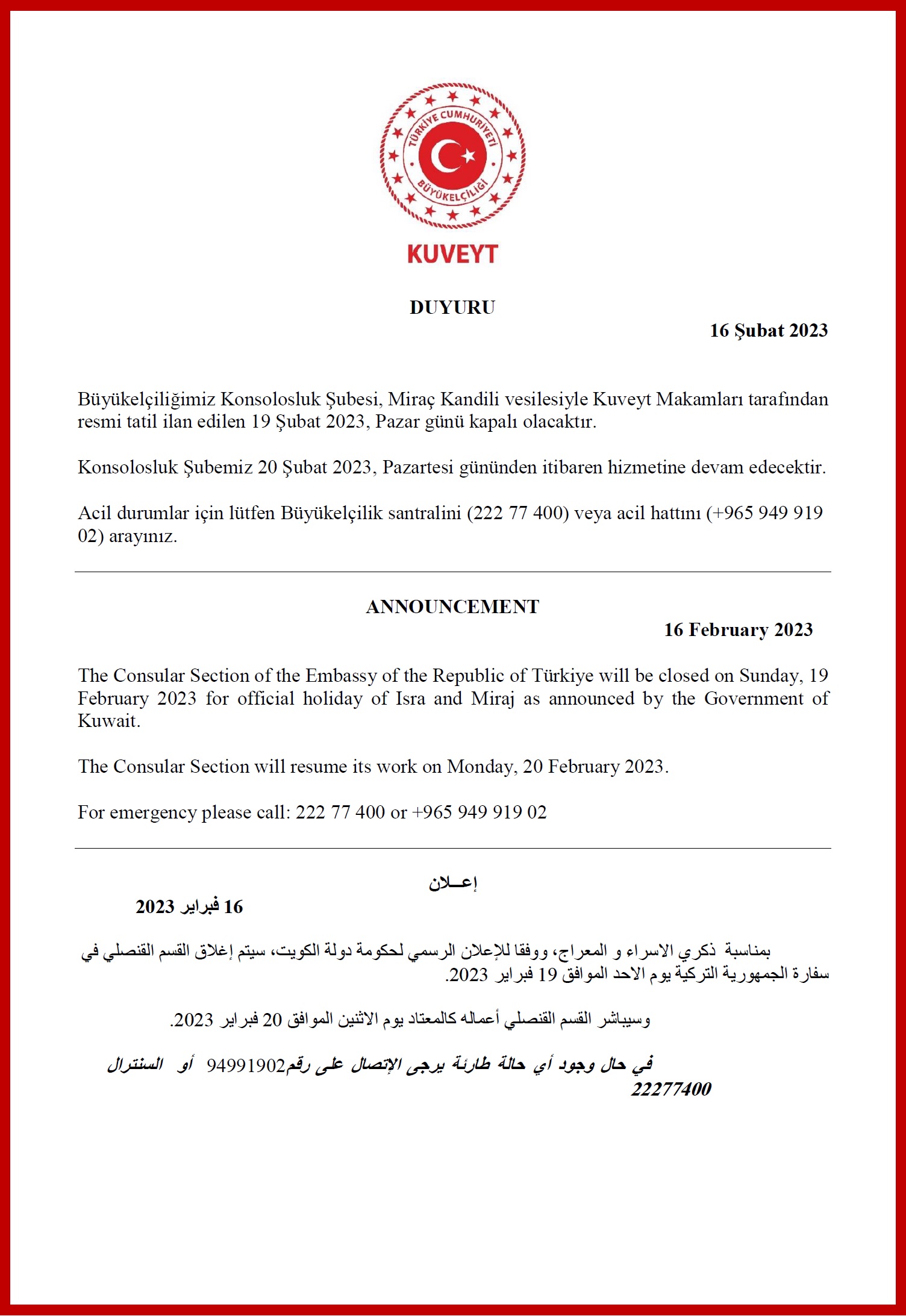 | 25.02.2026 | 26.02.2026 | Kuveyt Milli ve Kurtuluş günleri |