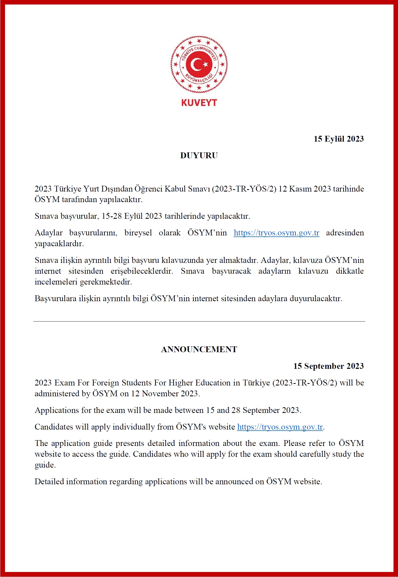 Yabancı Öğrenci Seçme Sınavı ( YÖS) Duyurusu