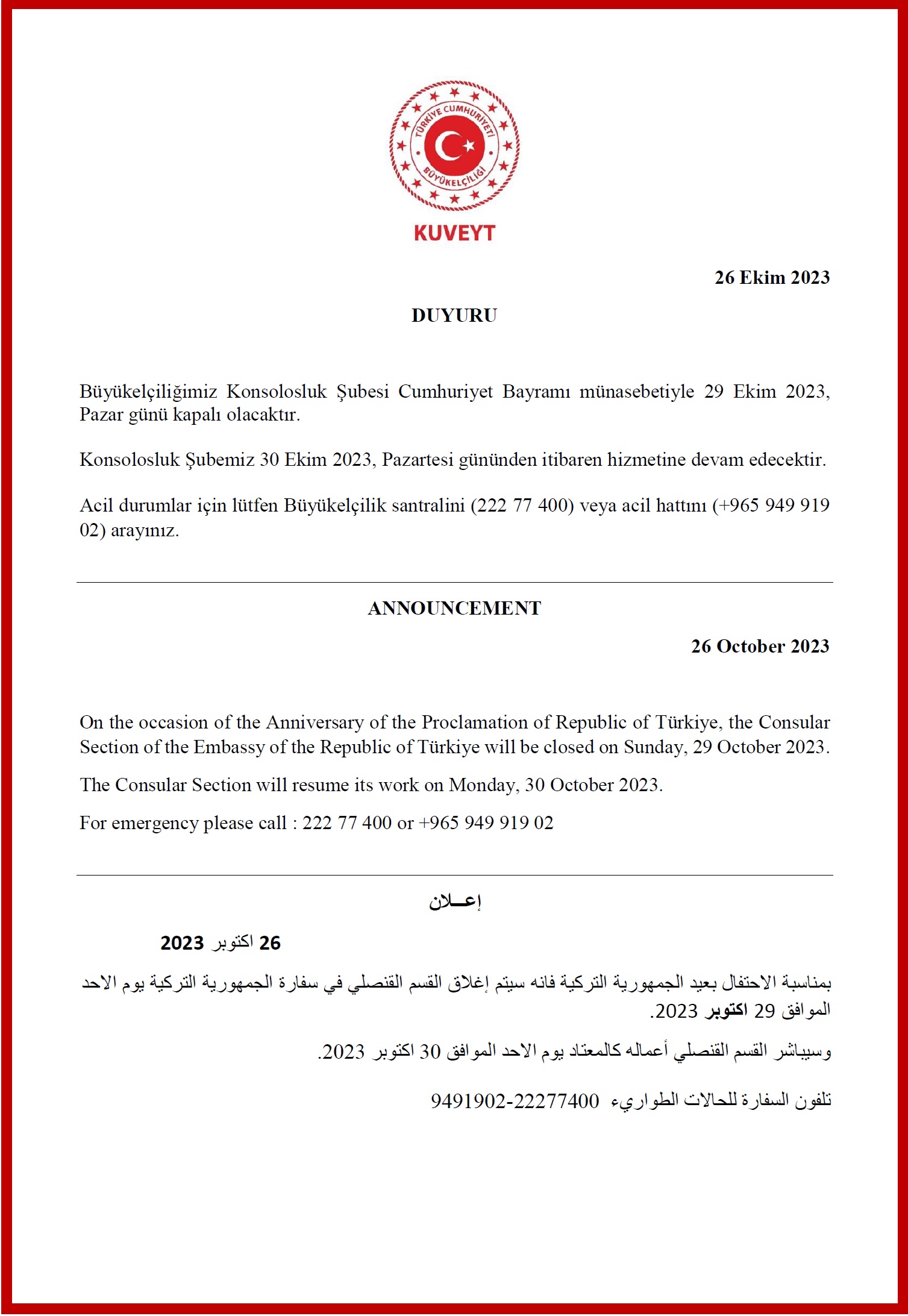 29 Ekim Cumhuriyet Bayramı Tatiline İlişkin Duyuru