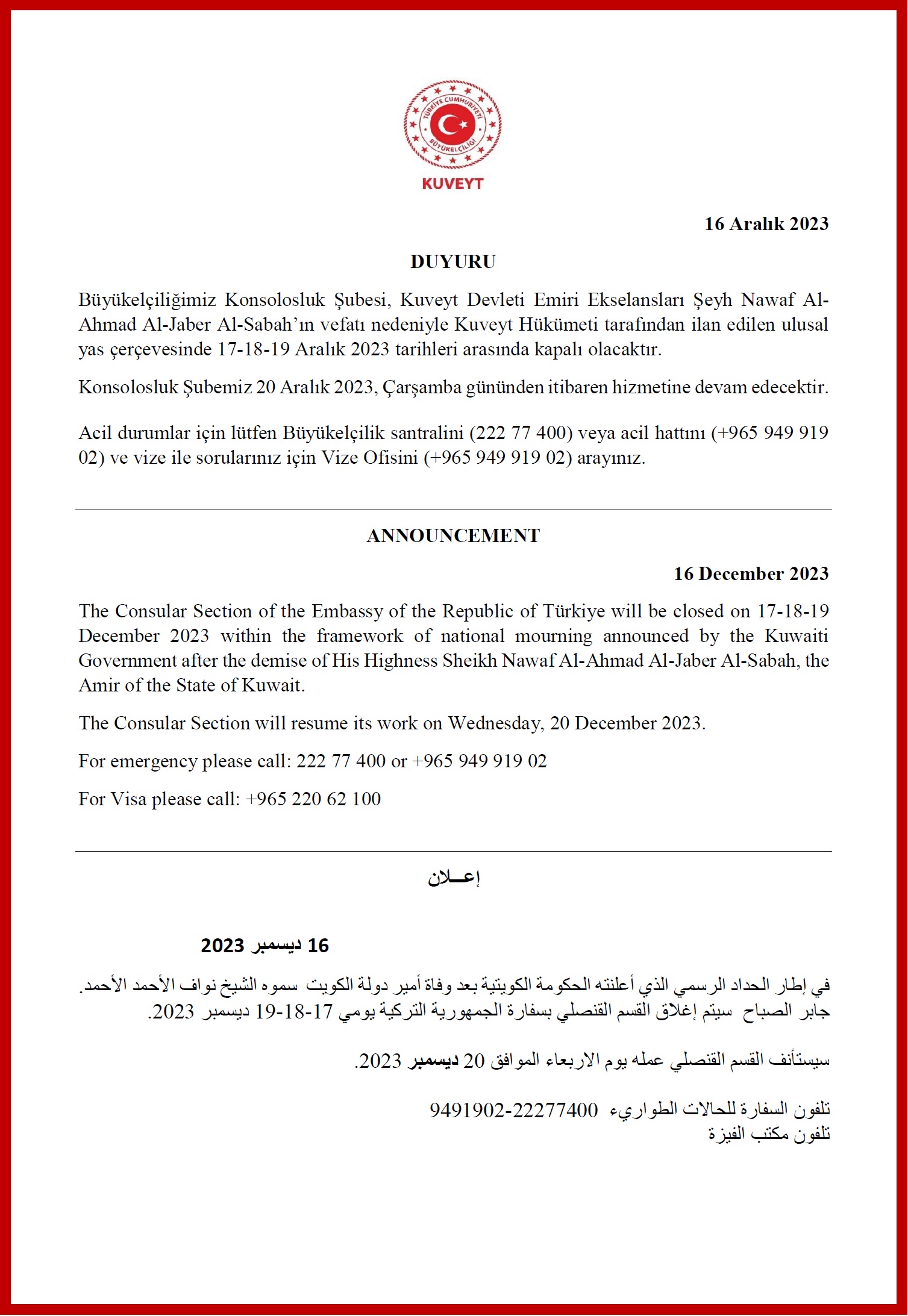 Kuveyt Emirinin Vefatı Nedeniyle Büyükelçiliğimiz Konsolosluk Şubesinin Kapalı Olacağına İlişkin Duyuru