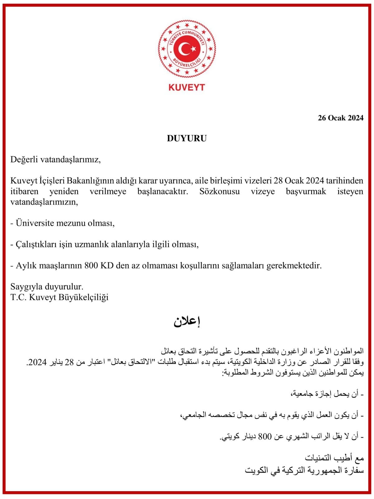 Aile Birleşimi Vizelerinin Yeniden Verilmeye Başlanacağına İlişkin Duyuru