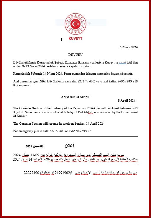 | 25.02.2026 | 26.02.2026 | Kuveyt Milli ve Kurtuluş günleri |