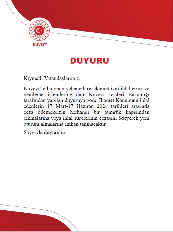 Kuveyt’te bulunan yabancıların ikamet izni ihlallerine ve yenileme işlemlerine dair Kuveyt İçişleri Bakanlığı Duyurusu