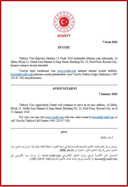 Türkiye Vize Başvuru Merkezinin Firma ve Adres Değişikliğine İlişkin Duyuru 7 Ocak 2026