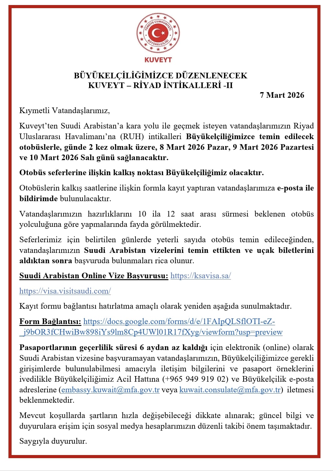 Büyükelçiliğimizce Düzenlenecek Kuveyt-Riyad İntikallerine İlişkin Duyuru-II